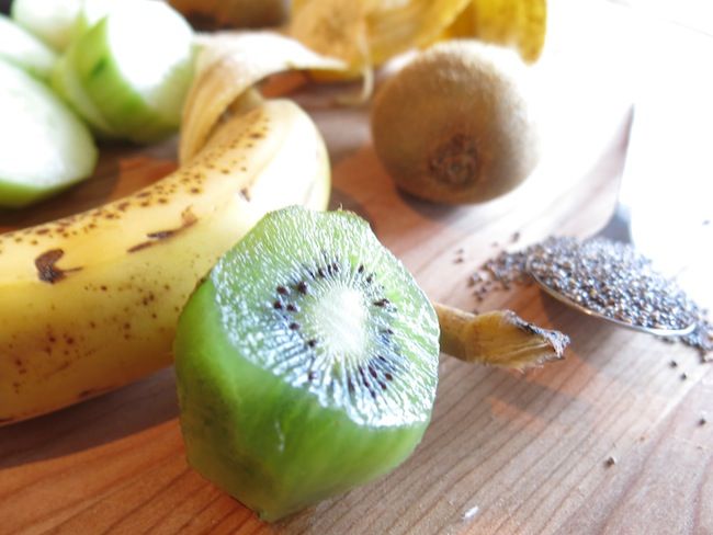 onsistance #kiwibanane #ingrdients #smoothie #rajouter #morceaux #adquate #obtenir #boisson #blender #plucher #bananes #couperBoisson - Smoothie kiwi/banane